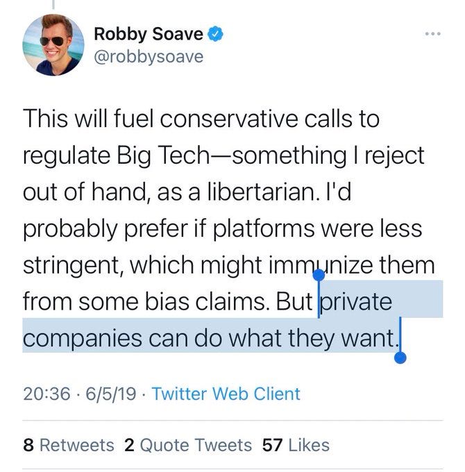 "private companies can do what they want" seems like a fantastic premise on its face, its ironic how that has come full-circle to bite the left in the ass. I wish more people in this country would wake up and see the encroaching censorship machine that's doomed to swallow us all. keep it up RPG
